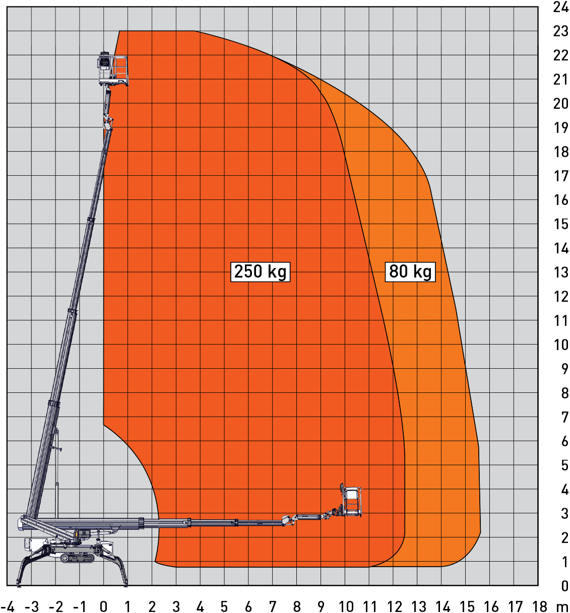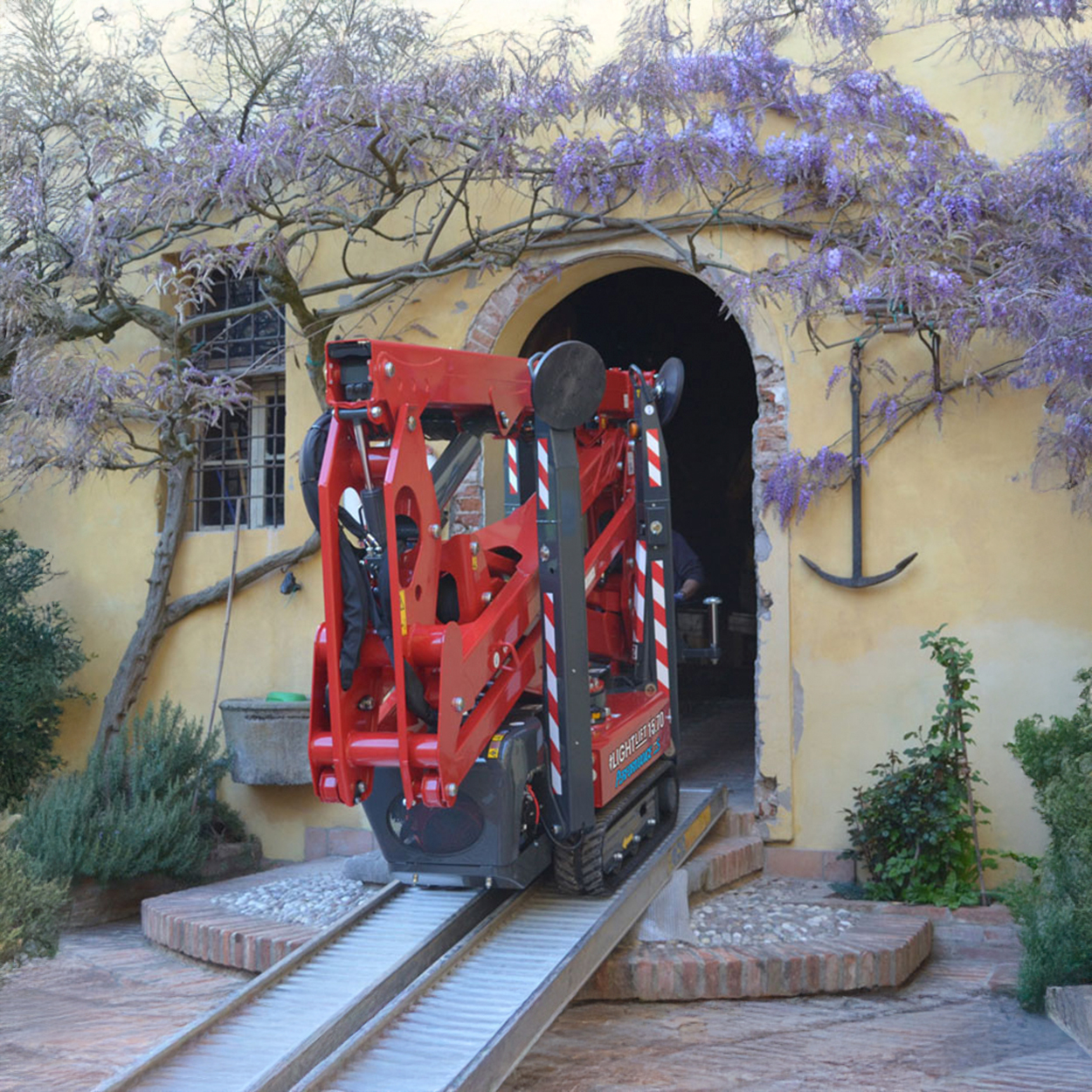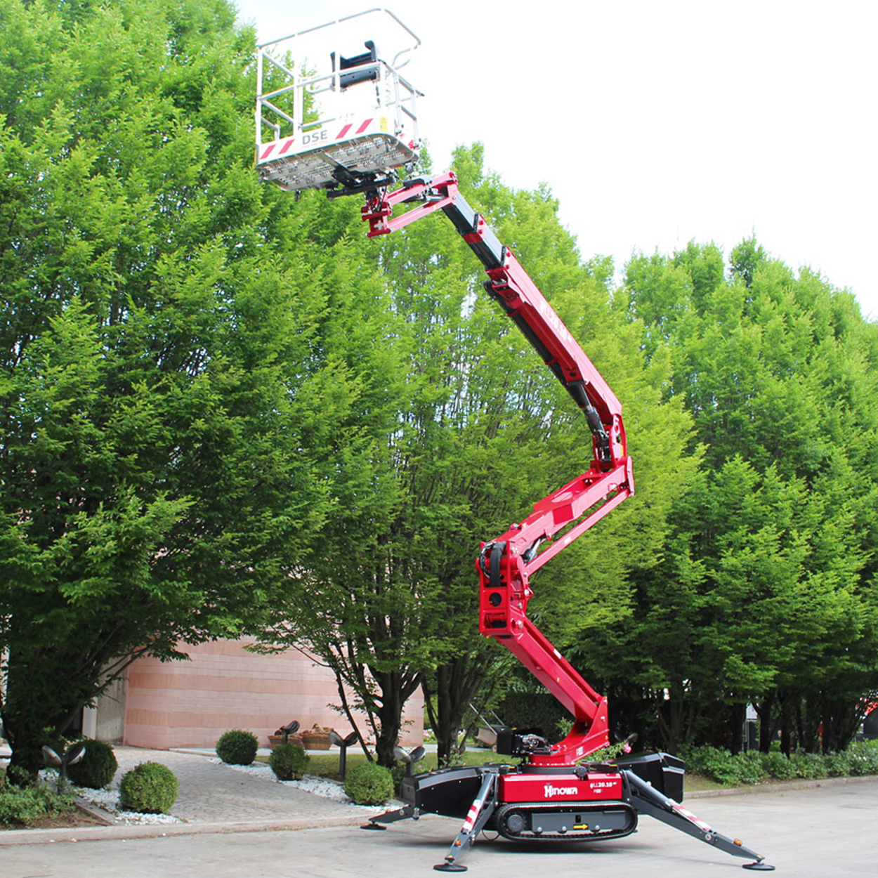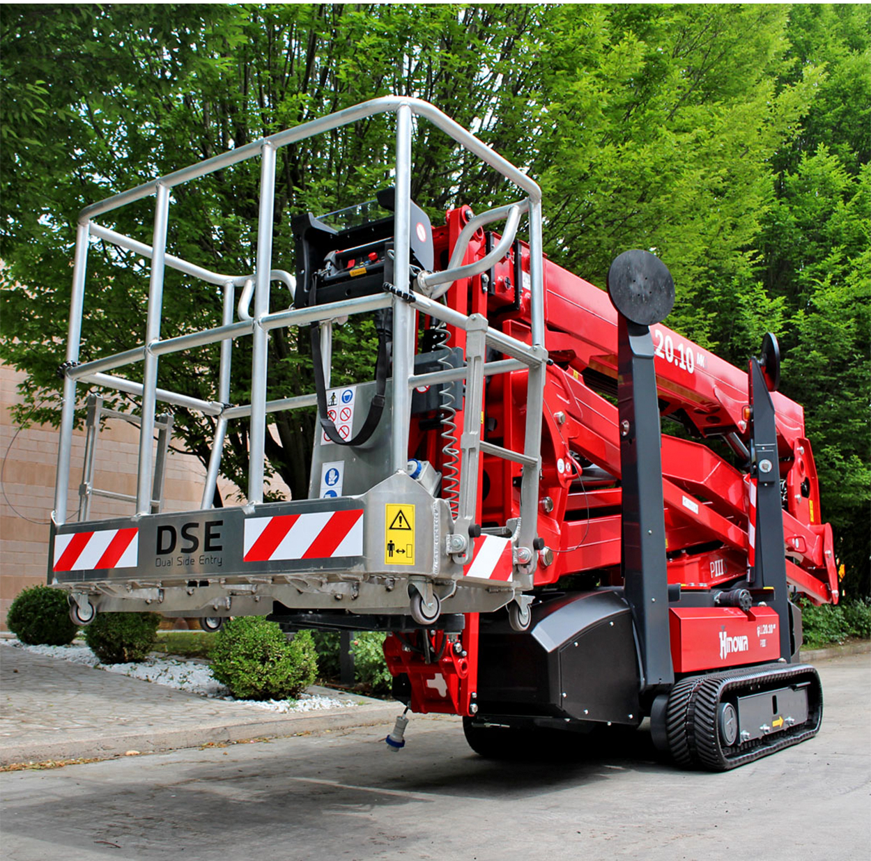 De brede gummibælter giver stabil kørsel over græs, fliser, jord og andre bløde eller uensartede overflader, mens støttebenene nivellerer maskinen for sikker og præcis placering. Dermed kan du opstille liften dér, hvor andre lifte må give op.