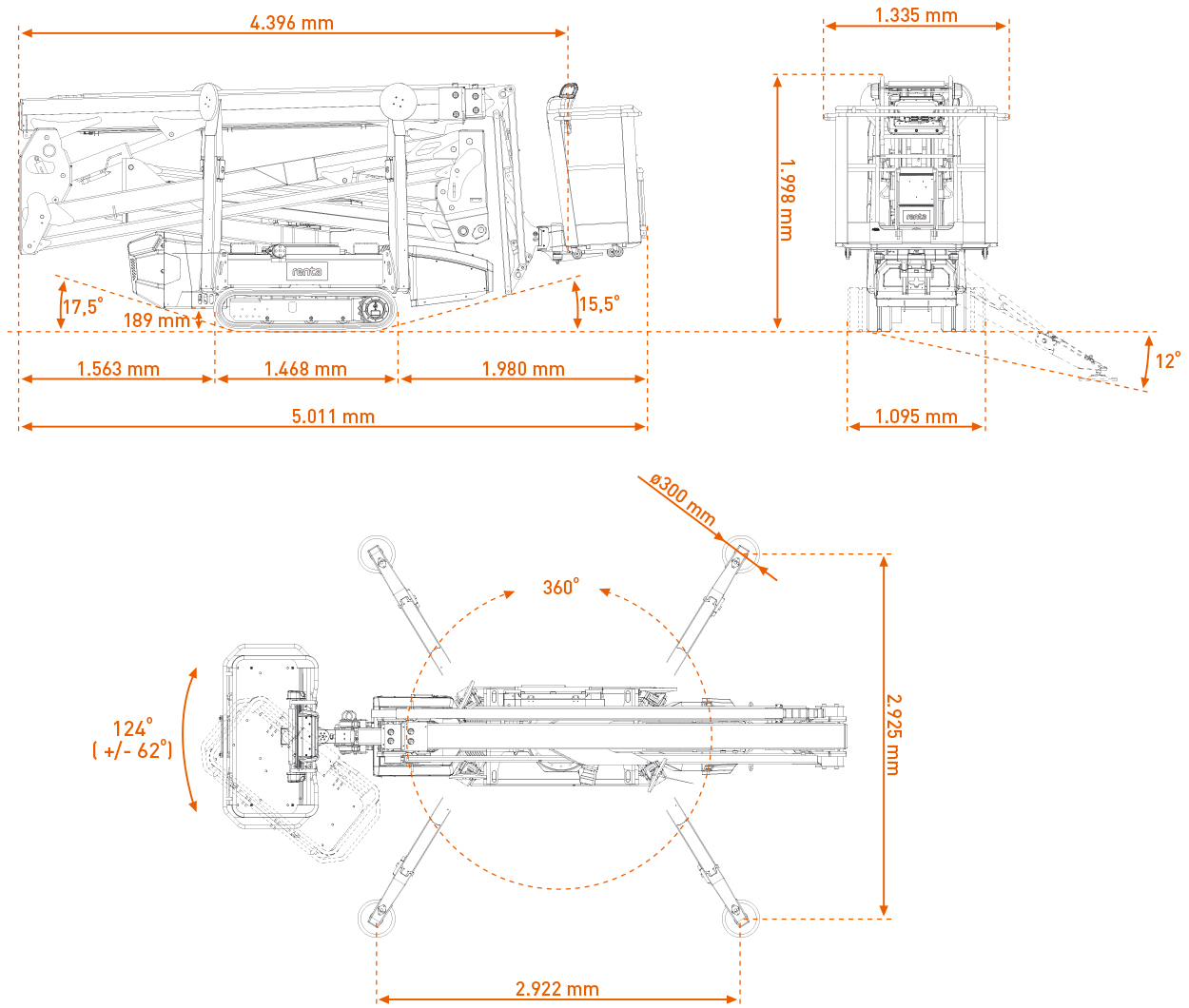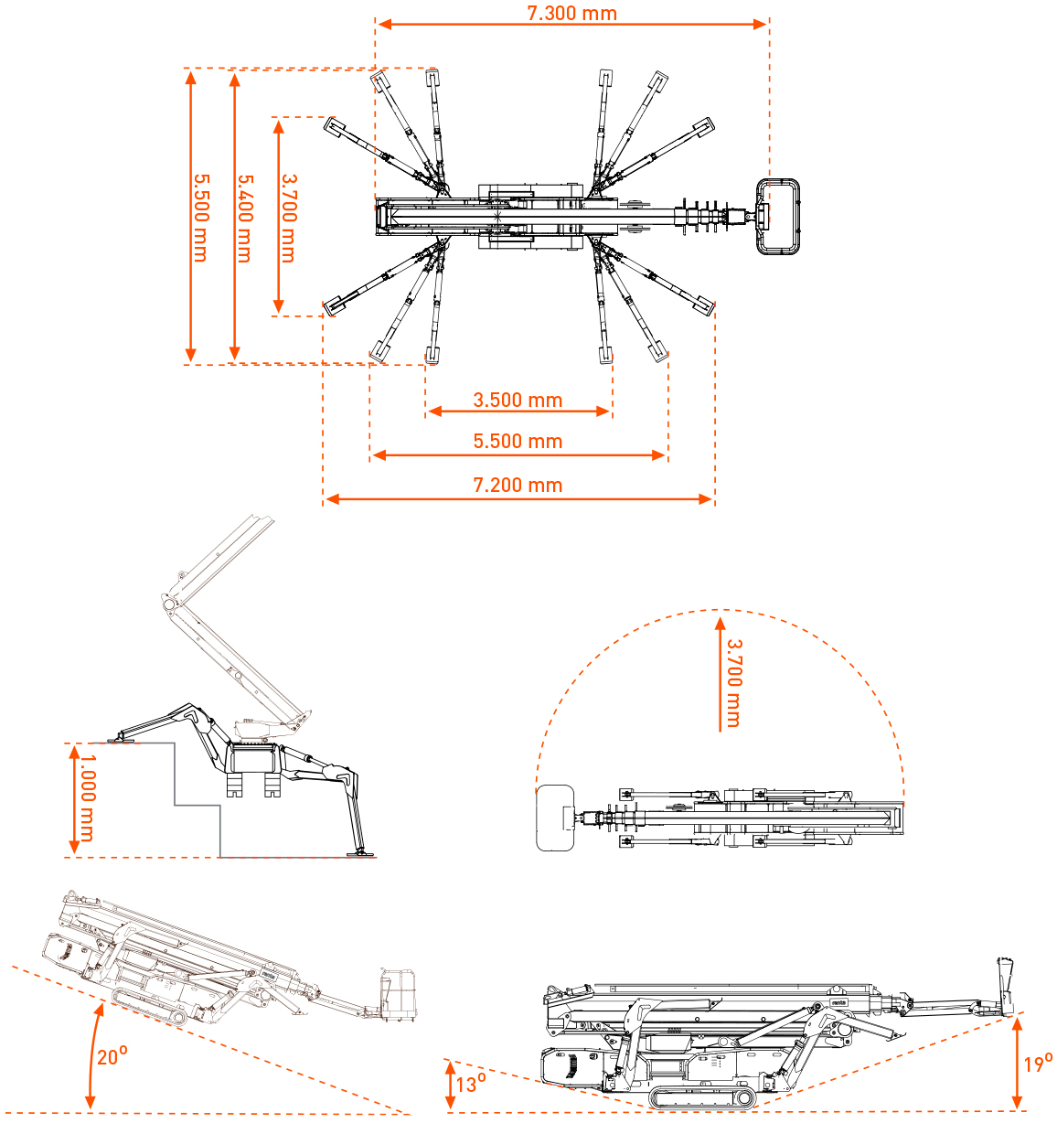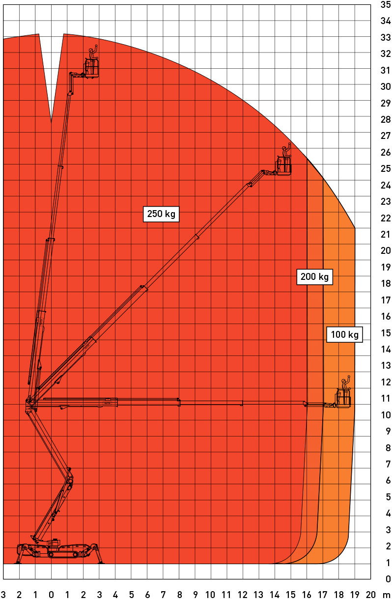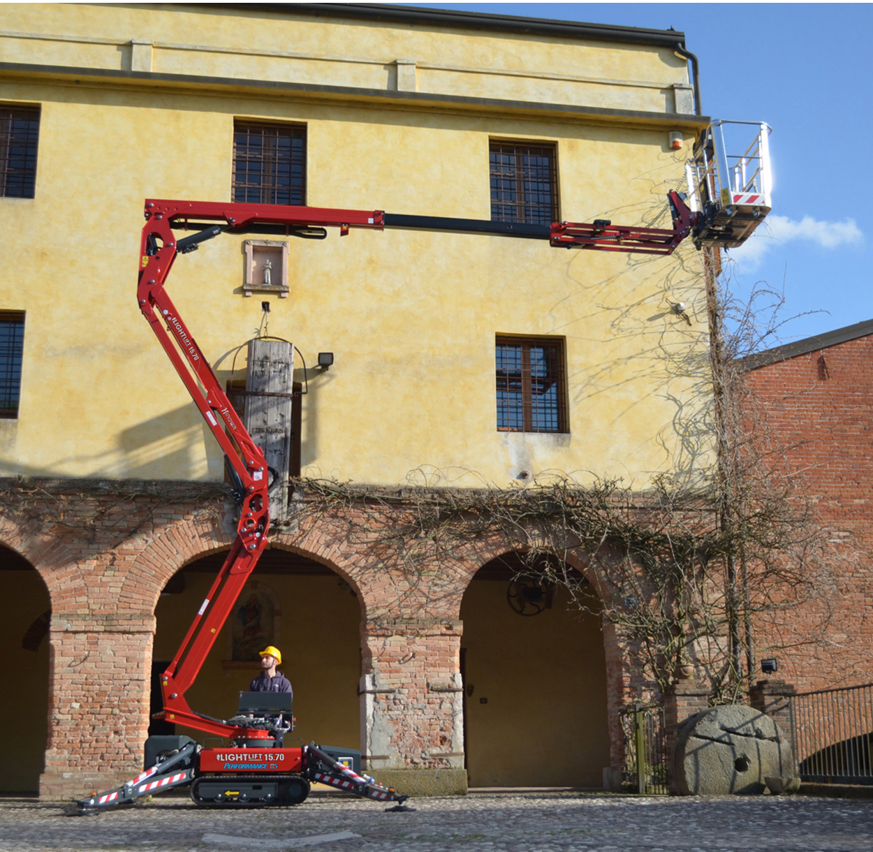 De brede gummibælter giver stabil kørsel over græs, fliser, jord og andre bløde eller uensartede overflader, mens støttebenene nivellerer maskinen for sikker og præcis placering. Dermed kan du opstille liften dér, hvor andre lifte må give op.