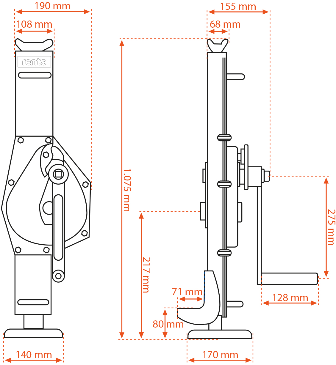 Denne model er bygget i kraftigt konstruktionsstål og udstyret med et hærdet hejseværk, som sikrer lang levetid og høj driftssikkerhed. Den manuelle tandstangsmekanisme – også kendt som “kaffemøllen” – giver dig fuld kontrol under løftet, og den indbyggede friktionsbremse i håndsvinget sørger for, at både løft og sænkning sker jævnt og sikkert.