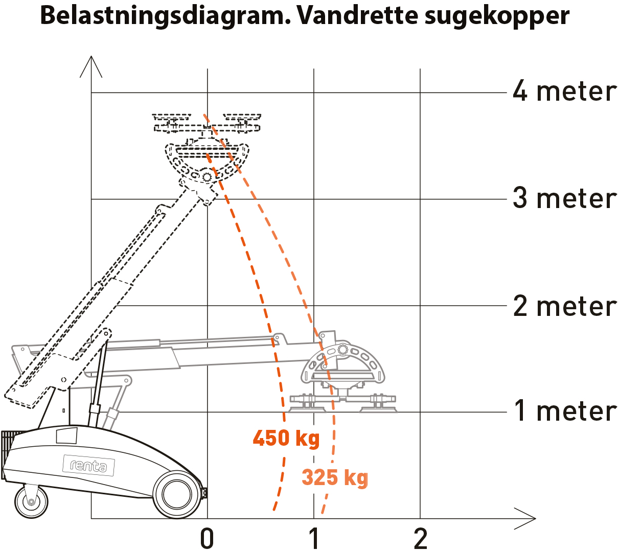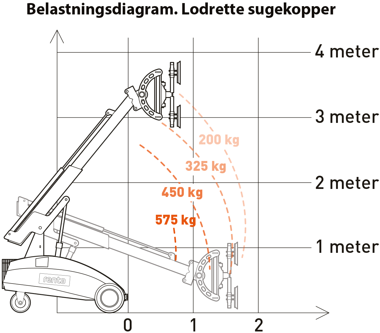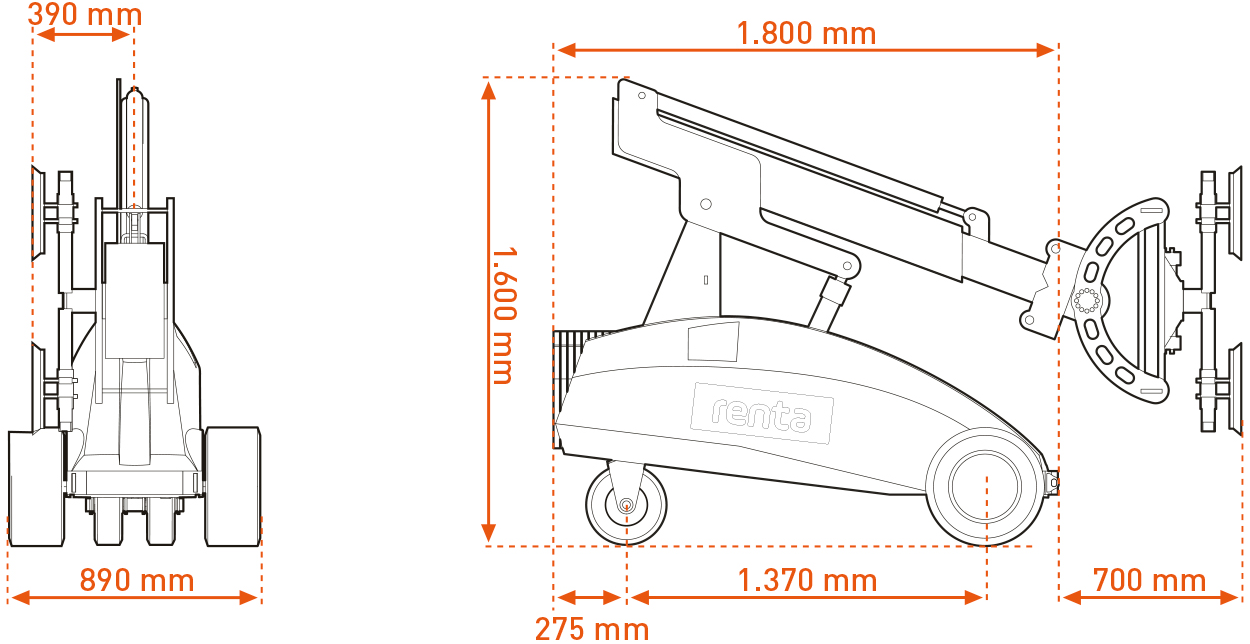 Maskinen er udstyret med fire kraftige sugekopper (Ø350 mm), der sikrer et stabilt og sikkert greb, uanset om du arbejder med lodrette eller vandrette emner. Med et maksimalt udskud på 1.800 mm og en maksimal last ved fuld udskud på 275 kg kan Win-Let 575 bruges effektivt til montage af både høje og brede facadepartier.