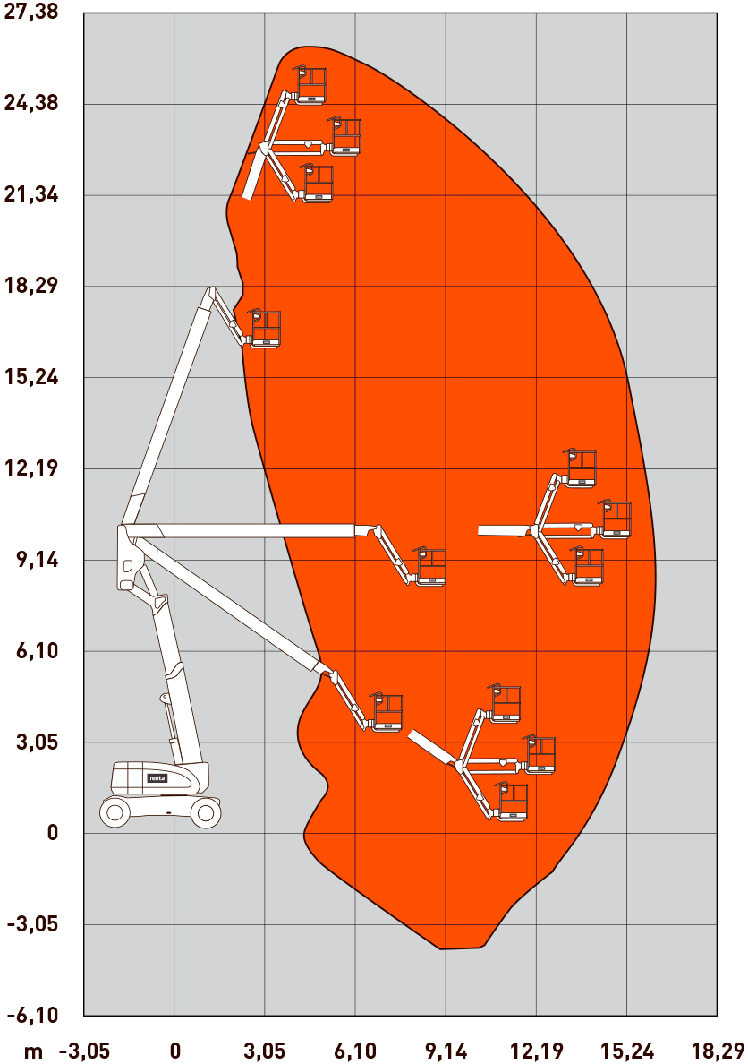 Liften er udstyret med knækarms-bom, som gør det muligt at arbejde op og ind over forhindringer som tagudhæng, rørføringer eller stillads. Samtidig er den bygget med terrængående egenskaber og 4-hjulstræk, så den står solidt og bevæger sig sikkert – selv på ujævnt underlag eller byggepladsens rå terræn.