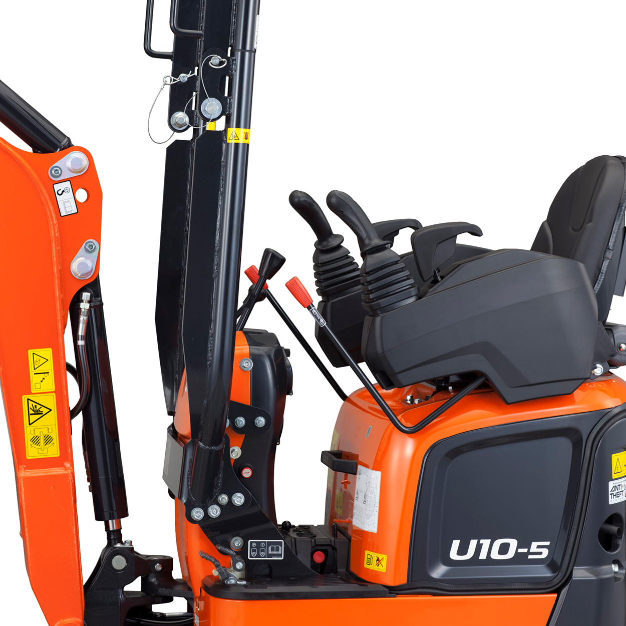 Kubota U10-5 er en ultra-kompakt minigraver, der leverer overraskende styrke i en let og manøvredygtig pakke. Med en egenvægt på kun 1.125 kg og en bredde, der passer gennem standarddøre og smalle passager, er den perfekt til opgaver i baggårde, boligområder og andre steder, hvor pladsen er knap.
