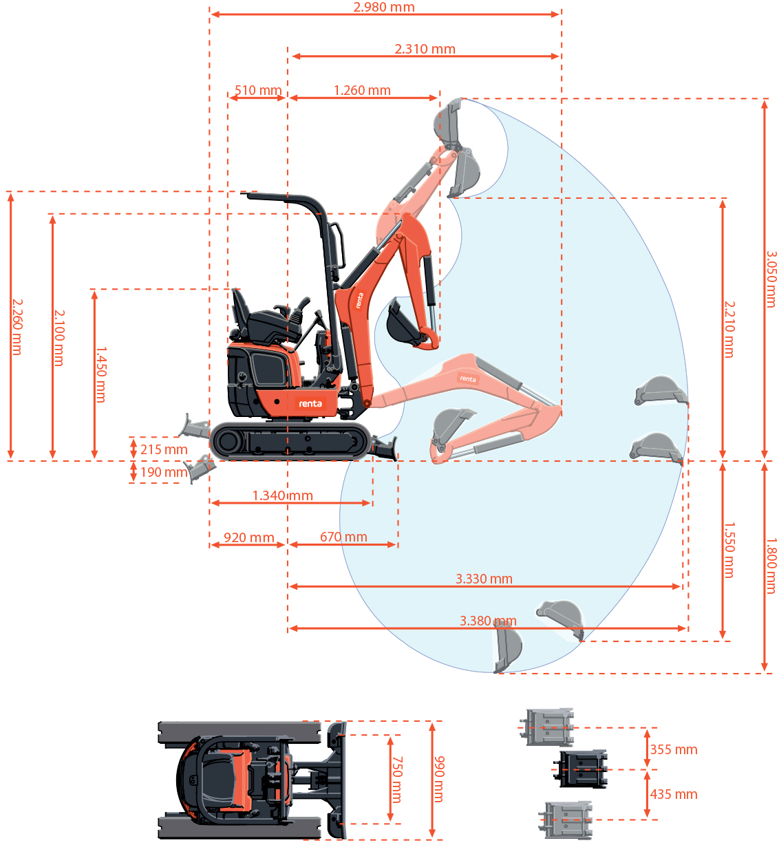 Gravearmen har en vinkel på 55° til begge sider, og den lave lyd- og vibrationsniveau gør den velegnet til arbejde i tæt bebyggelse eller indendørs udgravninger. Undervognen kan ofte justeres i bredden, så du kommer ind, hvor større maskiner må give op.