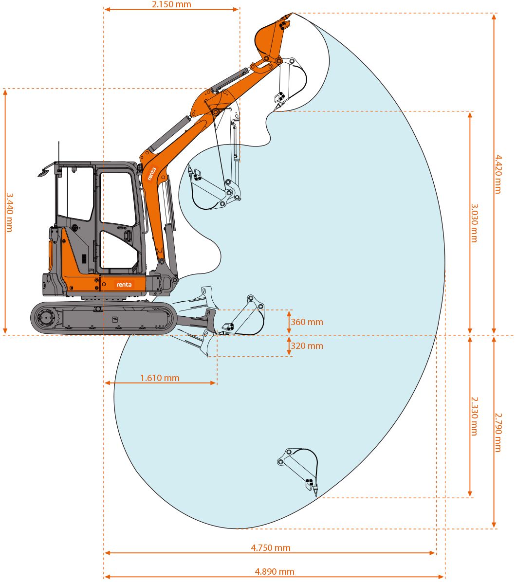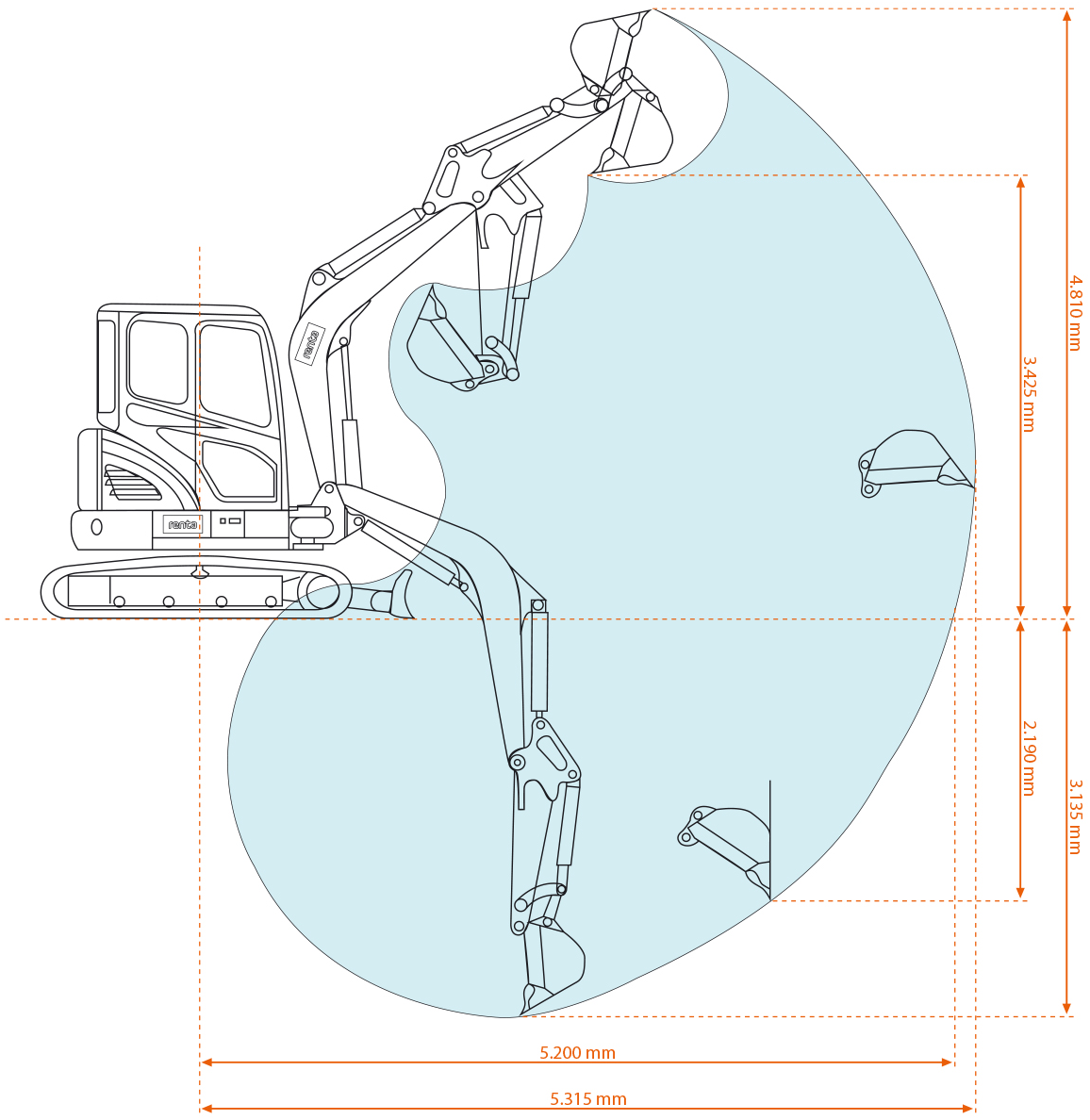 Denne model har en maksimal gravedybde på 3.135 mm og en rækkevidde på jorden op til 5.200 mm, hvilket giver dig et stort arbejdsområde og færre maskinflyt. Gravearmen har en vinkel på 75 grader til venstre og 50 grader til højre, så du nemt kan arbejde tæt på bygninger, rørføringer og andre forhindringer.