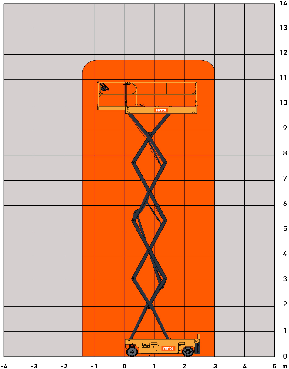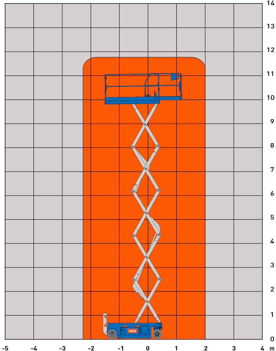 Med en bredde på ca. 1,2 meter er liften rummelig, men stadig kompakt nok til at komme rundt indendørs. Den kører på støjsvag batteridrift og har non-marking dæk, så du undgår mærker og gener på følsomme gulvoverflader.