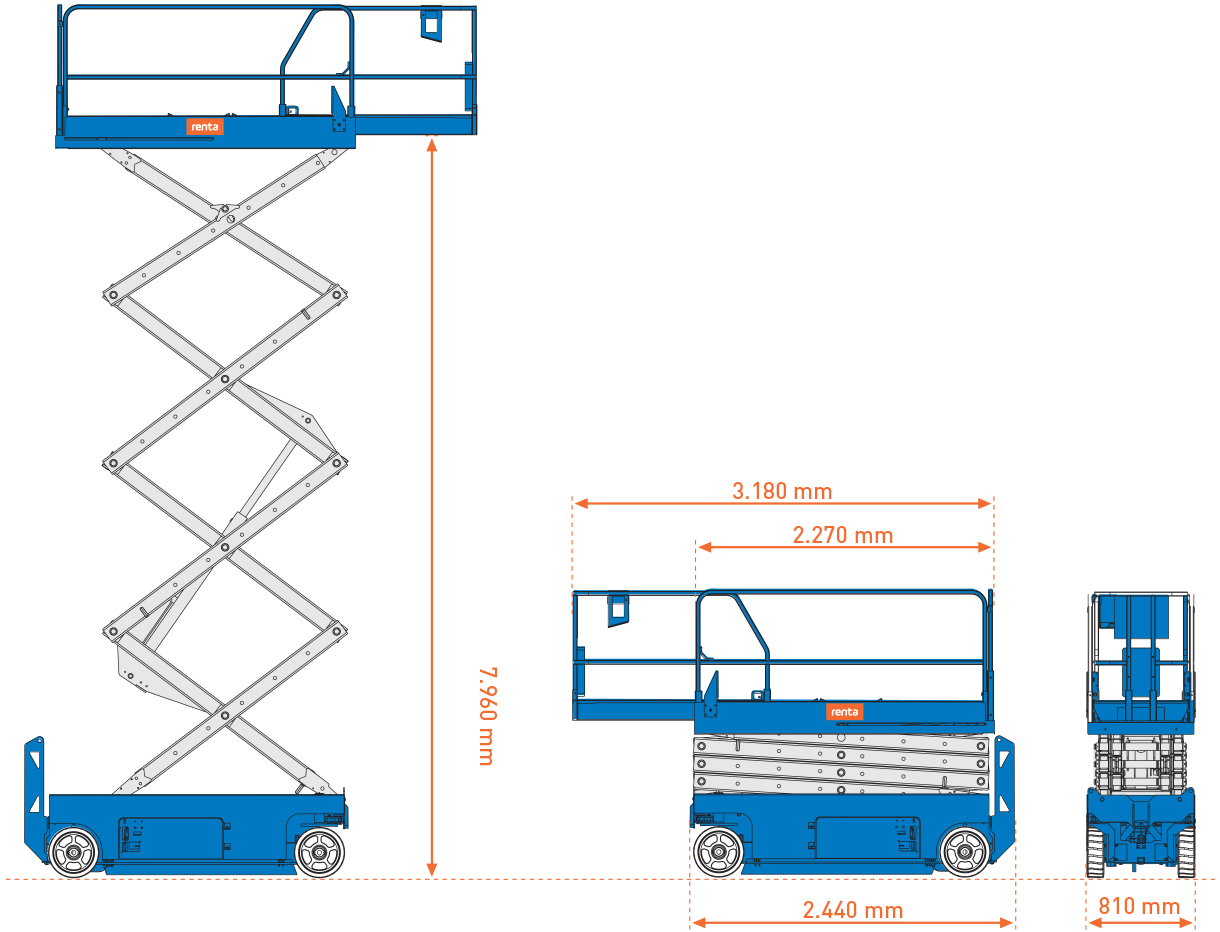Med en bredde på kun 0,81 meter er den blandt de smalleste lifte i 10-meter-klassen, og den kommer let gennem standarddøre og smalle passager. Liften er udstyret med non-marking dæk og batteridrift, så du kan arbejde på følsomme gulve uden støj eller mærker.