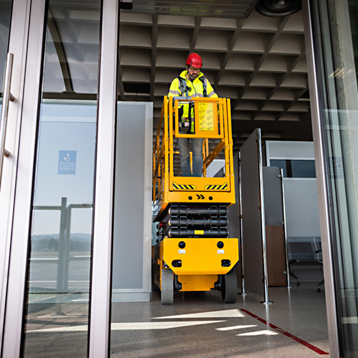 Med en bredde på kun 0,81 meter kommer liften nemt gennem smalle passager og standarddøre. Den er udstyret med non-marking dæk og kører på støjsvag el-drift, hvilket gør den ideel til brug på følsomme gulve og i støjfølsomme områder.